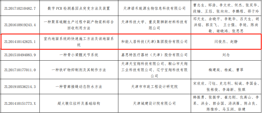 近日,天津市知識產權局公示了2022年度專利獎評審結果,由和能人居科技申報的發明專利ZL201410142625.1“室內地面系統的快速施工方法及該地面系統”榮獲天津市專利優秀獎。
