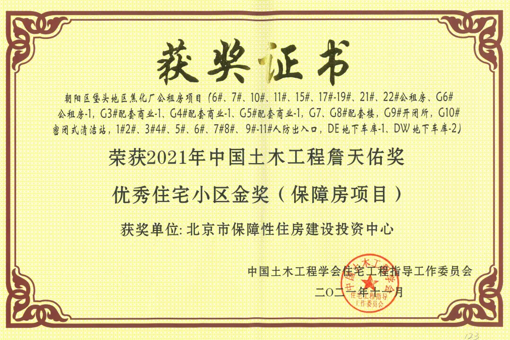 近日,北京保障房中心有限公司所屬百子灣項目、焦化廠項目雙雙獲得2021年中國土木工程詹天佑獎優秀住宅小區金獎。中國土木工程詹天佑獎(Tien-yow Jeme Civil Engineering Prize),由中國土木工程學會和北京詹天佑土木工程科學技術發展基金會聯合設立,是住房和城鄉建設部認定的全國建設系統工程獎勵項目和科技部首批核準的科技獎勵項目,也是中國土木工程領域工程建設項目科技創新的最高榮譽獎。包括百子灣項目、焦化廠項目,共有39個項目榮獲2021年中國土木工程詹天佑獎優秀住宅小區金獎。
